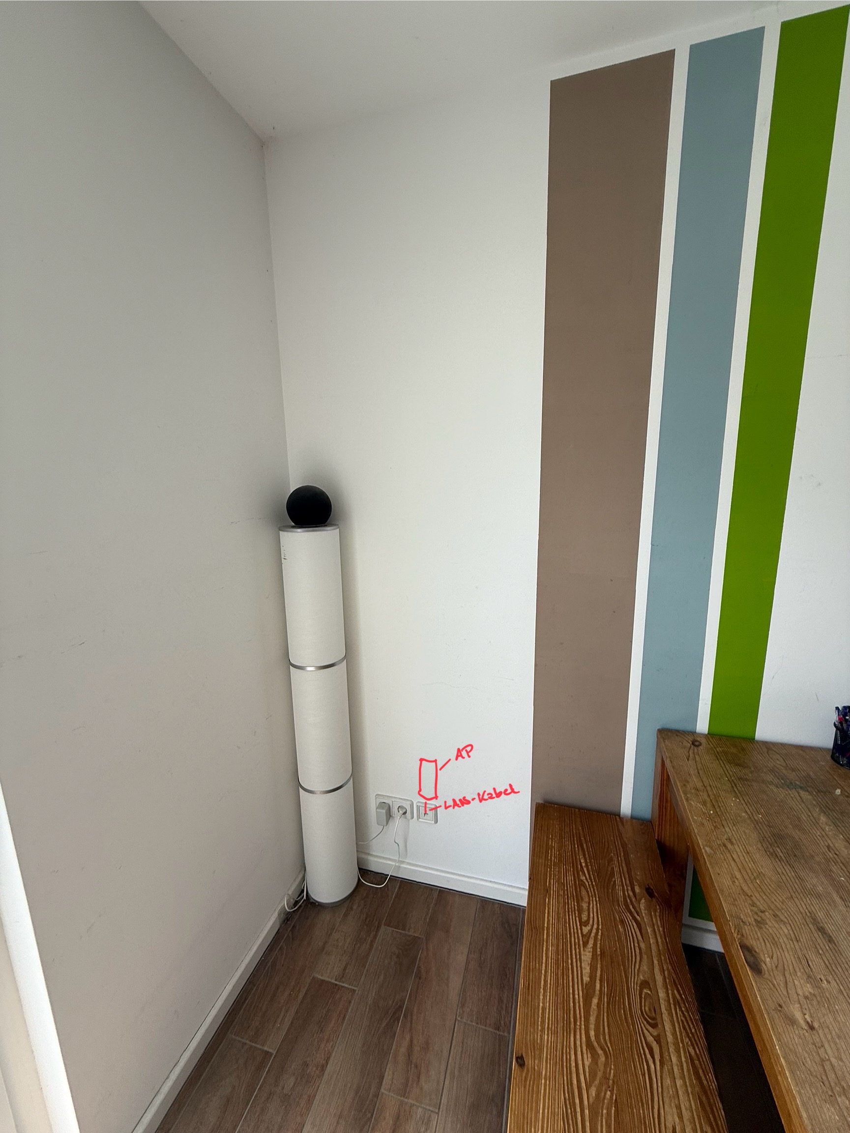 Na der Turm ist eine tendenziell wacklige Ikea-Lampe auf der ein Echo steht. Solange da keiner rankommt steht das gut, und der Echo ist auch halbwegs stabil, da er einen niedrigen Schwerpunkt hat. Aber da nochmal was drauf oder dazwischen stellen wird nicht gehen. Ich hab es mal ins Bild eingezeichnet wie ich es mir vorstelle: