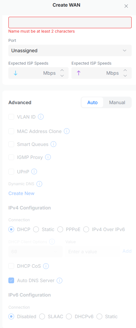 Ich würde ein neues WAN Interface anlegen. Kann ich das auf Auto lassen oder muss/sollte ich lieber manuell etwas einstellen?
