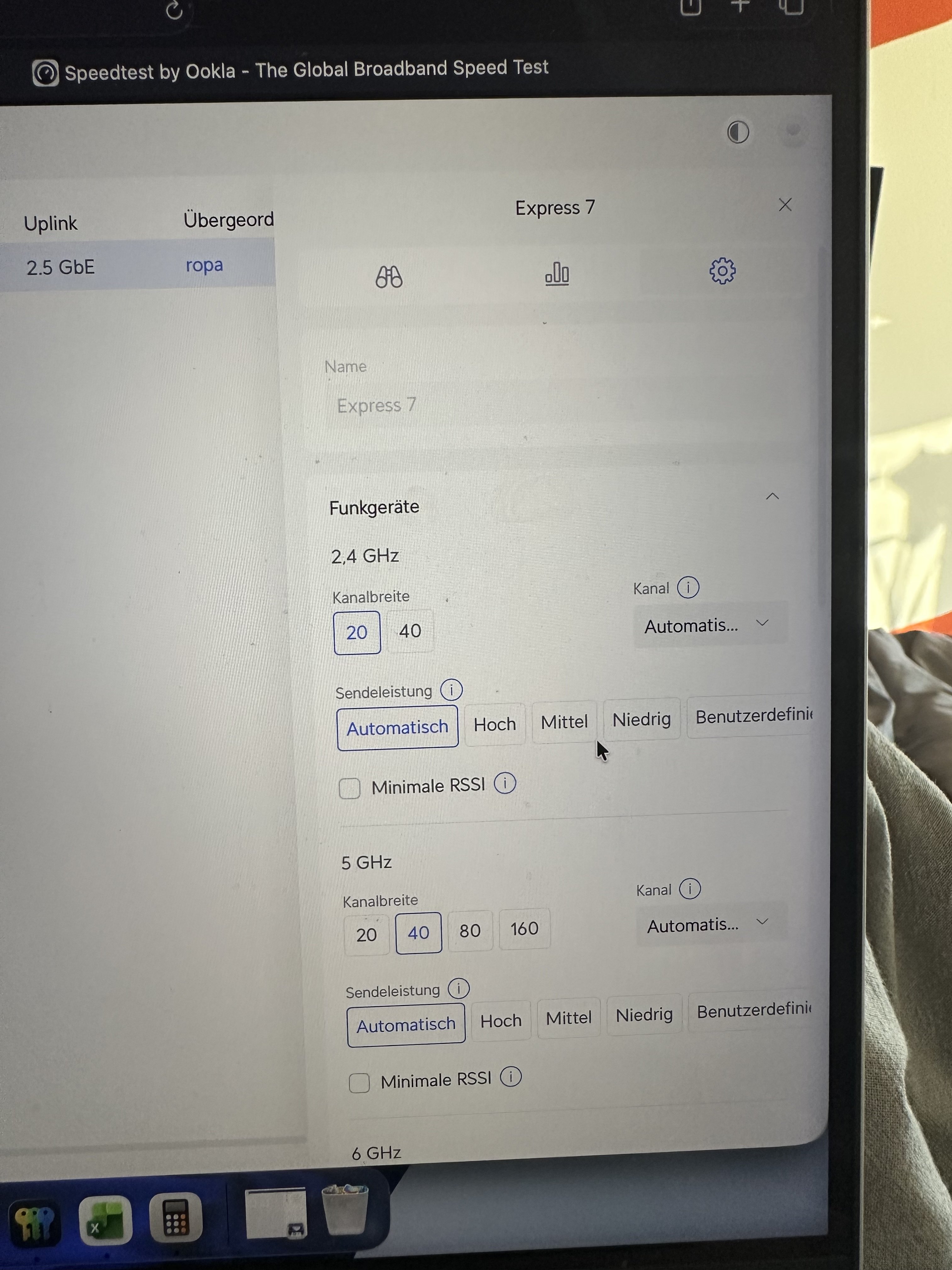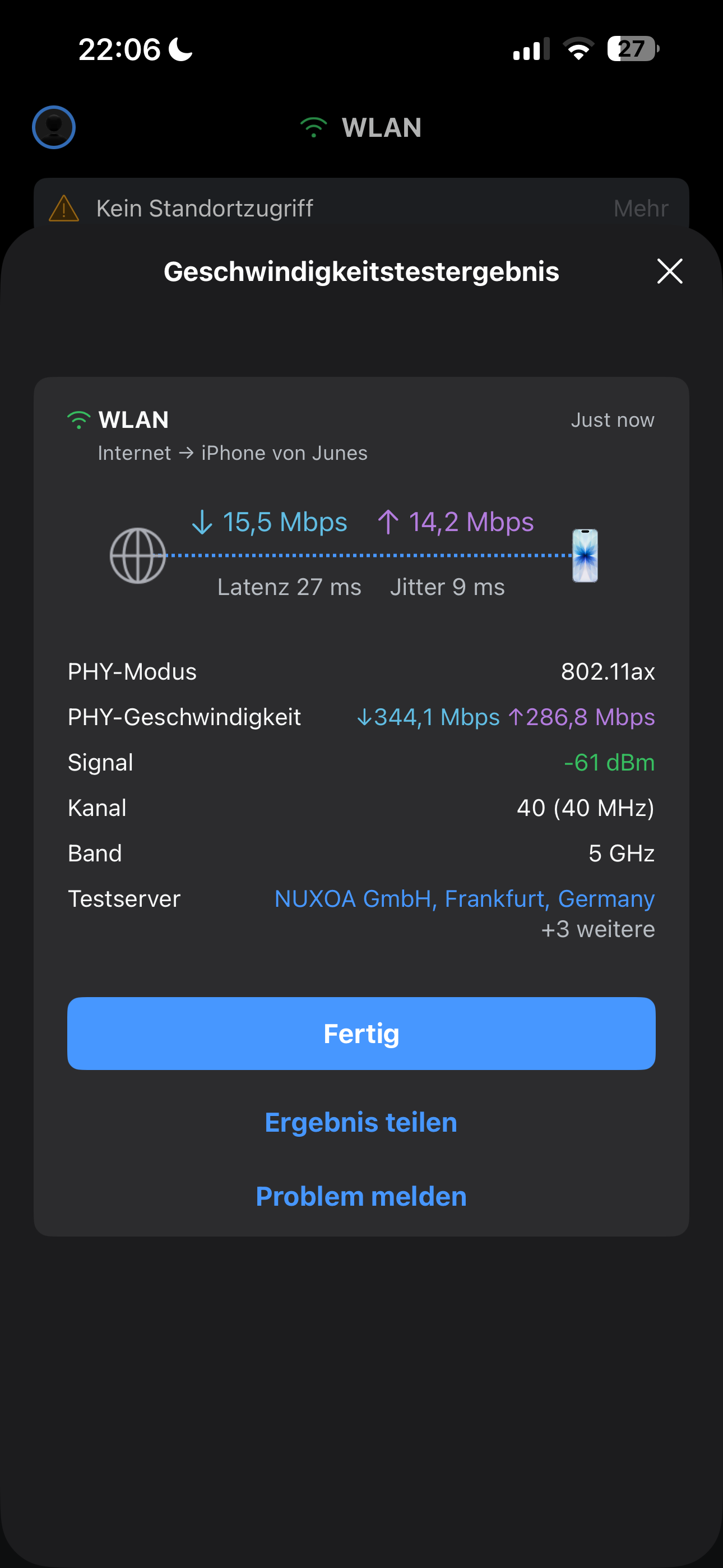 Im Schlafzimmer kommen 25 Mbit Down und 17 Mbit Up an.