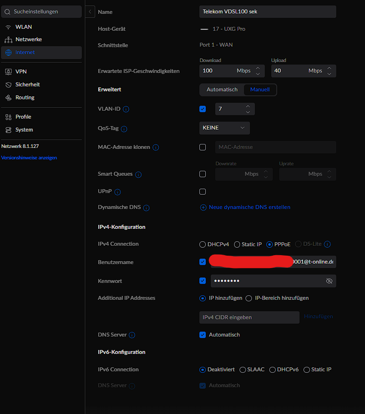 Ich habe mein UniFi Express ganz normal mit meinem Vigor Modem per Rj45 cat6 angeschlossen, und im UX dann die PPPoe Daten meines Telekom Anschlusses angegeben. Die Anschlussdaten werden scheinbar irgendwie erkannt und ich erhalte auch eine IP-Adresse der Telekom, nur ist die IP-Adresse das einzige was ich bekomme... Ins Internet komme ich dann wieder rum nicht, wenn ich in den Dashboard Reiter gehe erhalte ich die Meldung: Keine Internetverbindung seit XX:XX Minuten (Irgendwie so ist die Nachricht aufgebaut). Jetzt habe ich mal wieder meine alte Fritzbox an das Modem angeschlossen, und es funktioniert bisher ohne Probleme. Daher bin jetzt ehrlich gesagt etwas ahnungslos und suche nach einer möglichen Lösung...