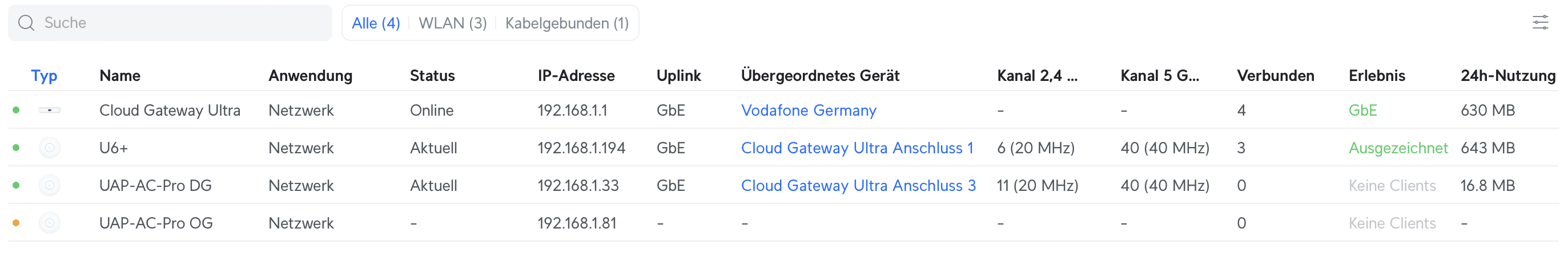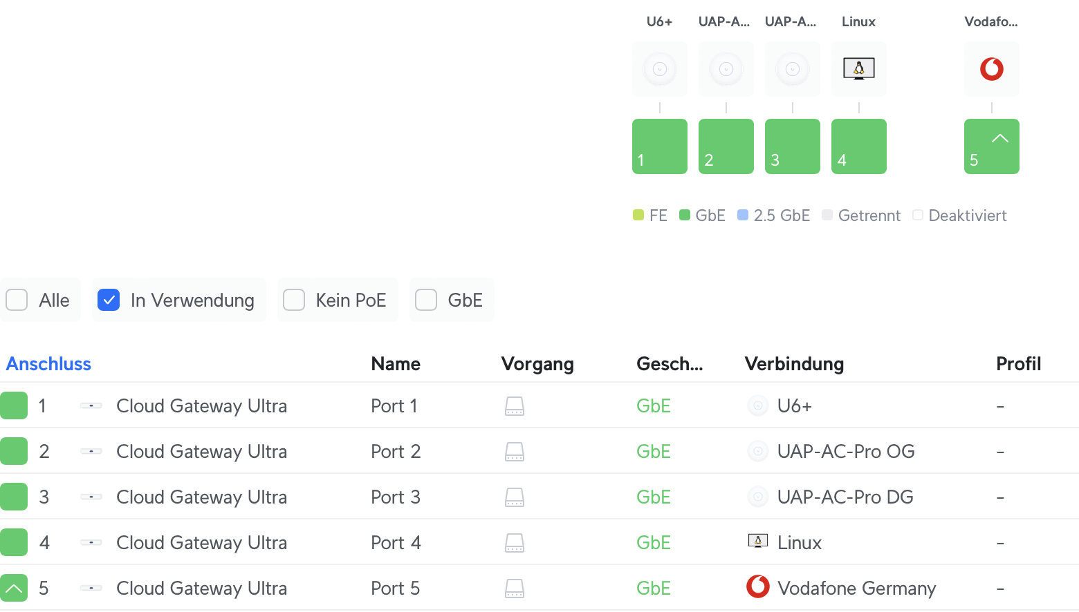 - Vodafone-Anschluss -> Vodafone Station -> 2,5 Gbit Port des UCG-Ultra -> Zyxel Switch