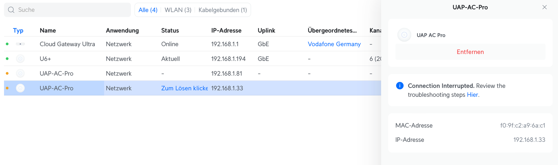 Die anderen beiden APs (AC-Pro) werden mir angezeigt, sowohl in der App, als auch am Laptop (über Kabel angeschlossen) bei unifi.ui.com. Jedoch lassen sich diese nicht hinzufügen. Fehlermeldung "Connection Interrupted."