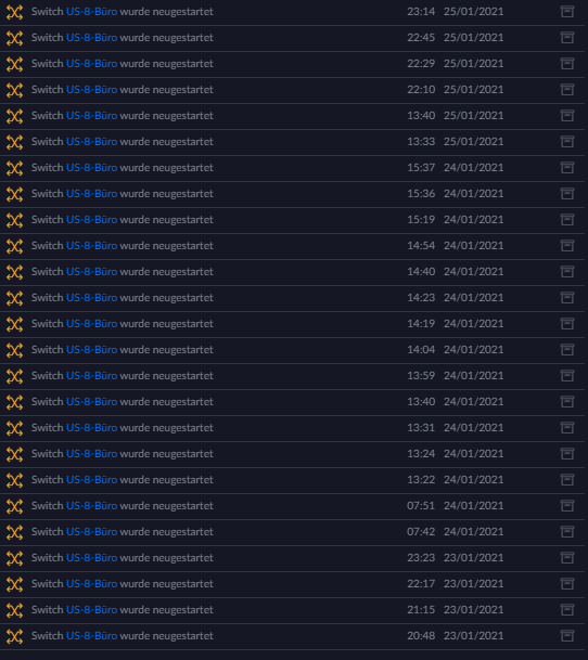 In meinen Alarmen wird immer angezeigt das mein Switch US-8-Büro neu gestartet wurde. Dieser hängt an einem US-8-150W mit PoE.