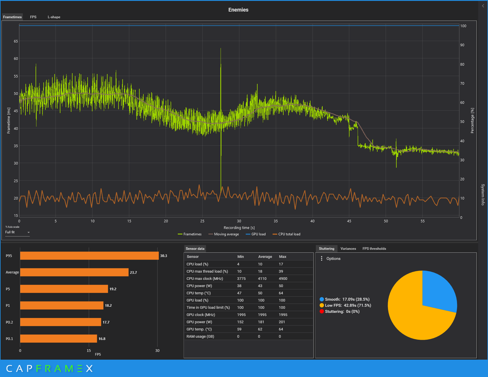 ...gemessen habe ich immer erst den zweiten Durchgang, da beim ersten Durchgang reproduzierbar jedes Mal, wenn der Tisch im Boden zu versinken schien, ein Nachladeruckler auftrat.