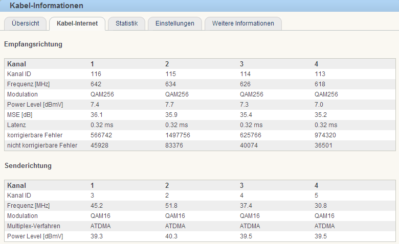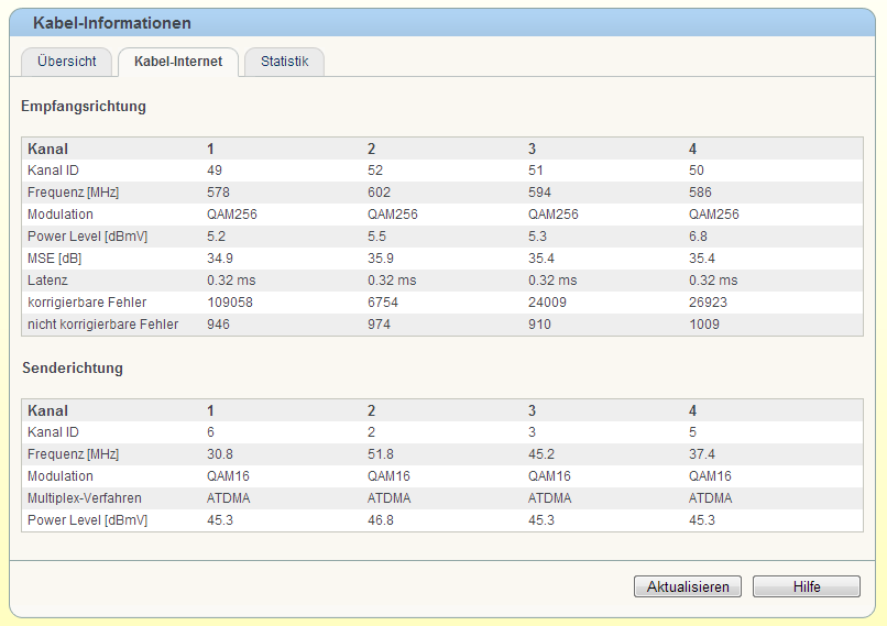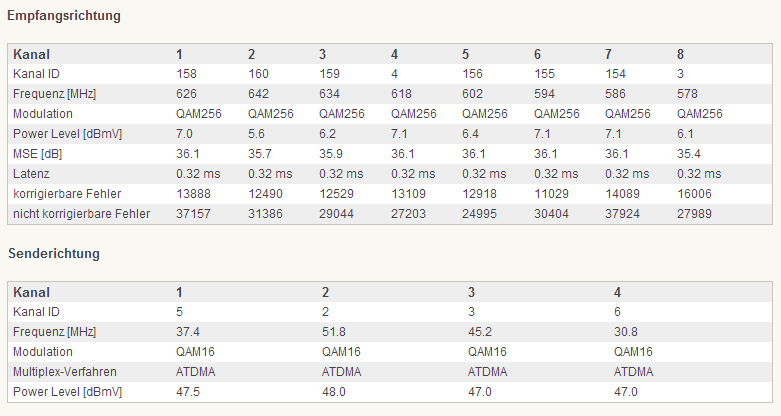 Als der Fehler aufgetreten ist, habe ich direkt bei Unitymedia angerufen, dass die eine Momentanaufnahme der Werte sehen können. Solltest du deinen Telefonanschluss von Unitymedia haben, ggf. mit dem Mobiltelefon anrufen, da die Verbindung abbrechen könnte (ist aber dann kostenpflichtig - bis zu 60ct/Anruf).
