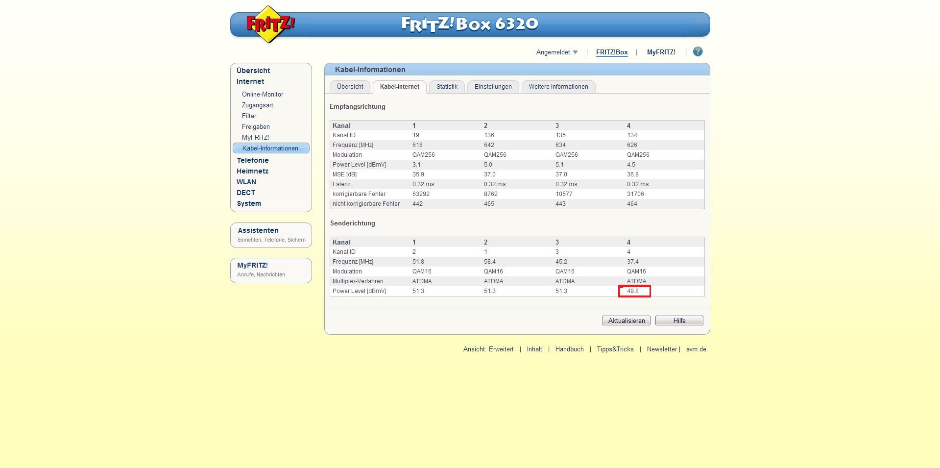 @1.Update: @Pitam: Ich habe diesen Wert angesprochen mit den Technikern, die sich mit der Fritz!Box auskennen und sie haben mir gesagt, dass dieser Wert nur von 42 dBmV bis 50 dBmV gehen darf und alles, was darüber geht schlecht ist. Auswirkungen wären Störungen bzw. Unterbrechungen/Aussetzer in Senderichtung bzgl. Telefonat/Internet. Ich habe dann weiter gefragt, warum sich die Techniker sich gestern nicht, wie versprochen gemeldet haben und mir wurde gesagt, dass sie das wahrscheinlich vergessen haben und dass bei ihm auf dem Computer der Auftrag bis Montag geht und ich am Montag eine Antwort erhalten werde. So wie es aussieht muss auf jeden Fall ein Techniker nochmal vorbeikommen und sich anschauen, ob das Problem an der Fritz!Box liegt oder am Anschluss. Davor wird aber auch noch überprüft, ob mit der Straße alles ok ist.