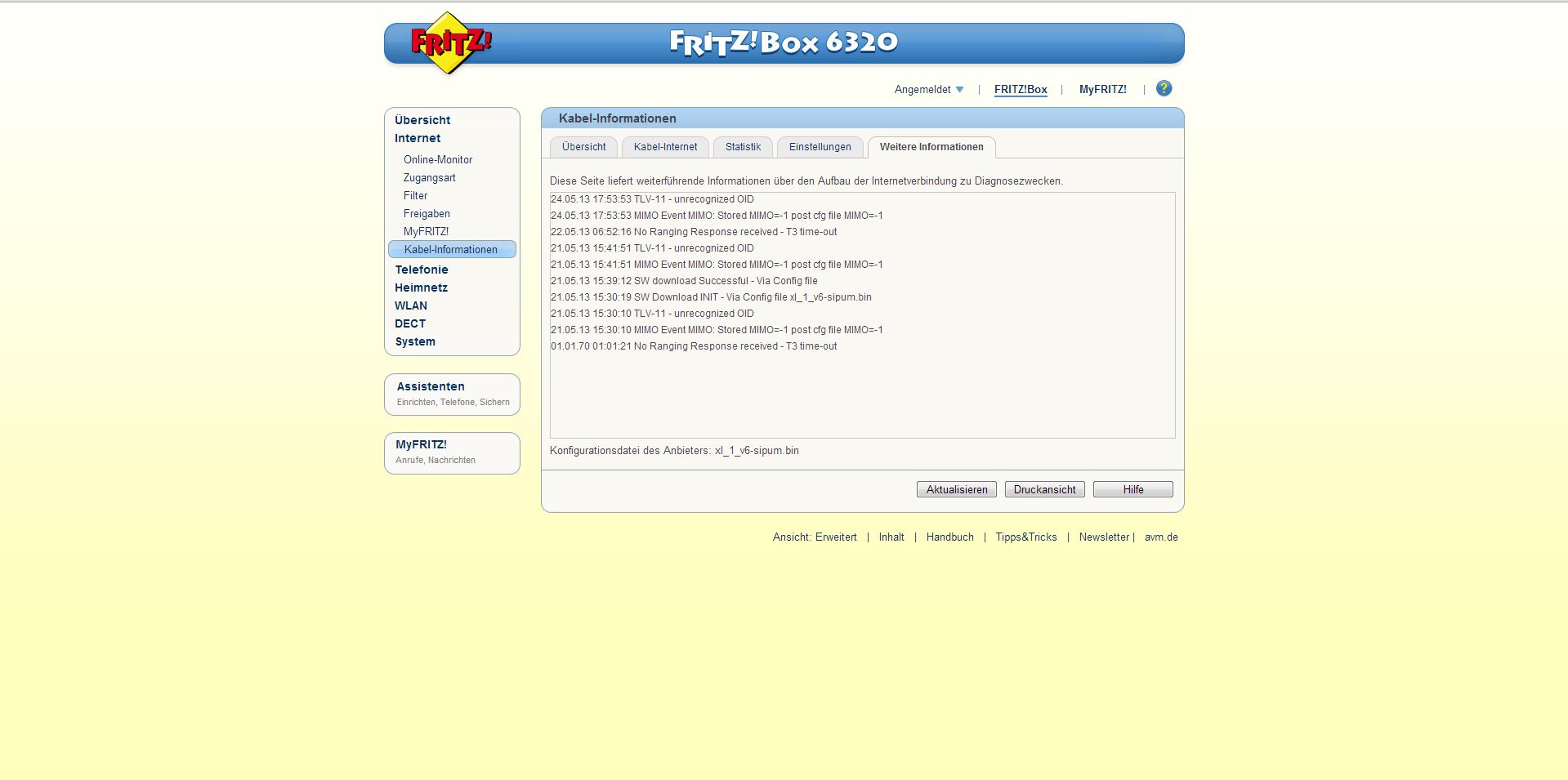 geh auf http://192.168.100.1/ und poste deine werte.