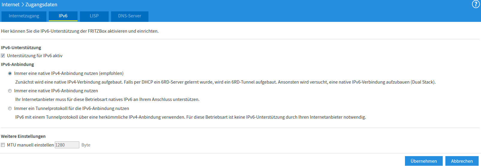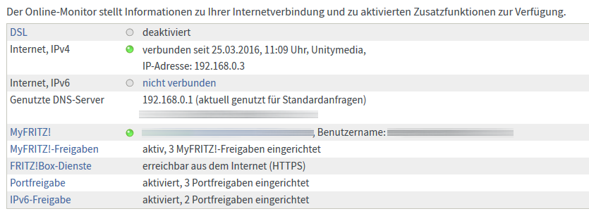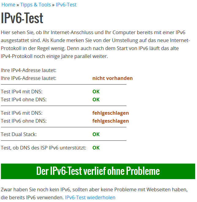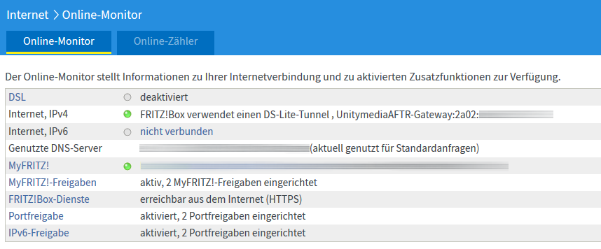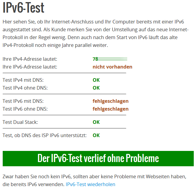 Vielleicht sollte ich noch dazu sagen, dass ich in der Fritzbox IPv6 aktiviert habe, Geräte im Heimnetz haben auch eine 6-er IP bekommen, aber in der Fritzbox leuchtet das IPv6 nicht auf (grau) nur IPv4 steht auf grün.