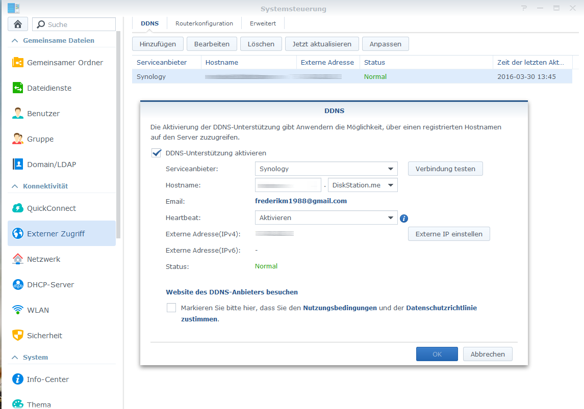 Auch wenn ich den DDNS von Synology nutze und bei FesteIP eintrage geht es nicht. Obwohl es im NAS der STATUS auf Normal steht.