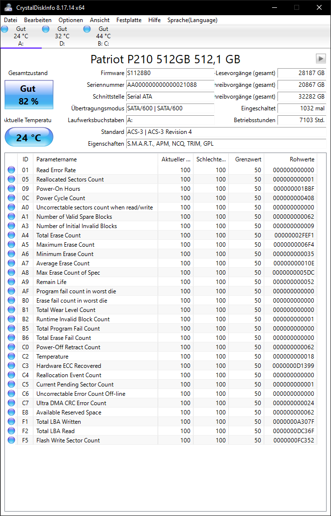 Hier sind nochmal die 3 Festplatten in crystalDisk