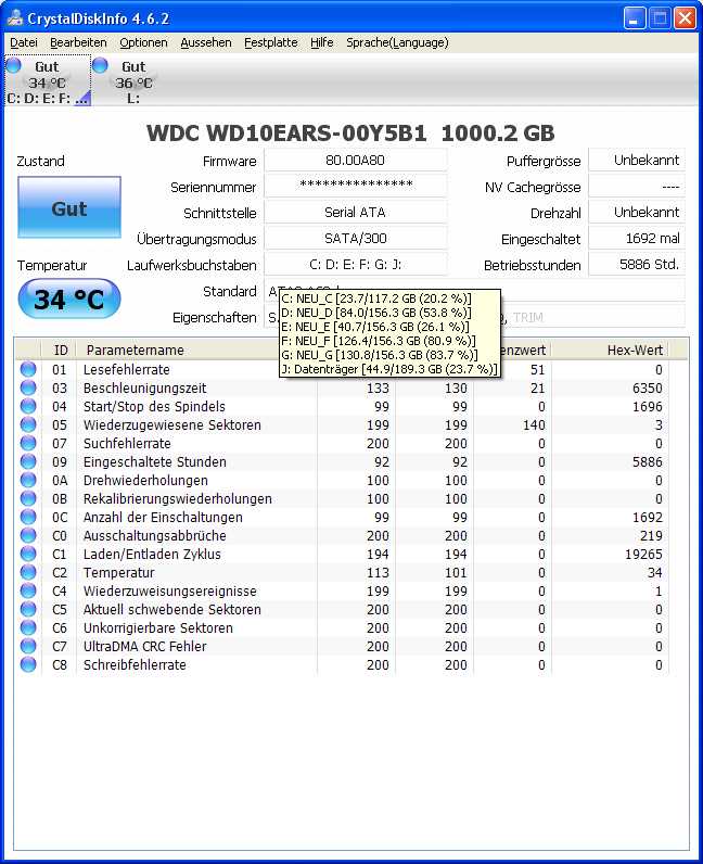Dann habe ich mal mit GParted die OSX-Partitionen gelöscht und eine NTFS Partition darauf angelegt. Danach wieder mit CDI die SMART Werte angeschaut: nichts mehr! Keine unkorrigierbaren und auch keine schwebenden Sektoren! Status "Gut"