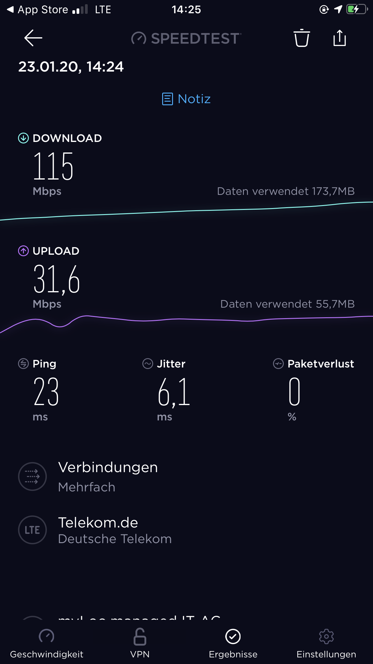 Da sieht die Telekom keinen Stich. Und dabei ist das sogar ein Hybrid Vertrag mit 50 MBit. D.h. O² kommt mit nem Free S auf die fast vierfache Geschwindigkeit als die Telekom mit DSL + LTE die damit knapp 33% des Solls meines Vertrages erreicht.