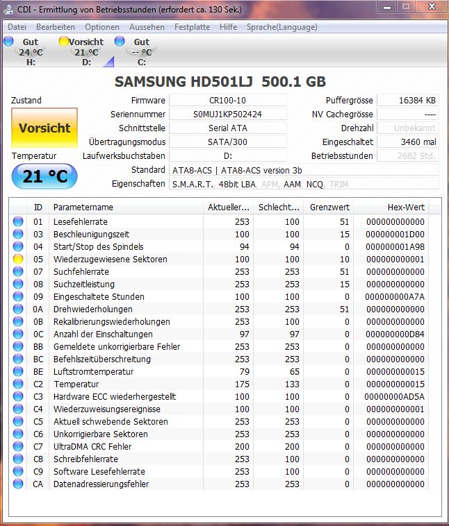 die Festplatte bekommt auch bei CrystalDiskInfo eine Warnung. Sie ist aber auch schon ein paar Jahre alt.