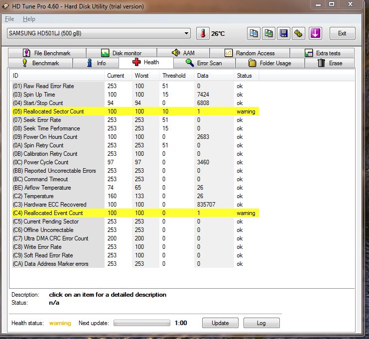 Der Zustand der Platte sieht nicht gut aus (verbrauchte Reservesektoren). Sofern du noch Garantie hast, tausche die Platte um. Kontrolliere die SMART Werte zur Sicherheit noch mal mit CrystalDiskInfo.