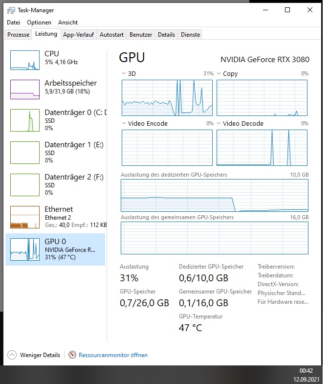 Ich habe dann die 3080 eingebaut, alten Treiber deinstalliert und den neuesten Treiber installiert, und innerhalb kurzer Zeit trat das beschriebene Problem auf, regelmässig wurde der Bildschirm kurz schwarz (Monitor selbst war aber anscheinend an, der schwarze Bildschirm war auch etwas kürzer, als wenn dieser Monitor z.B. zwischen zwei Frequenzen umschaltet.