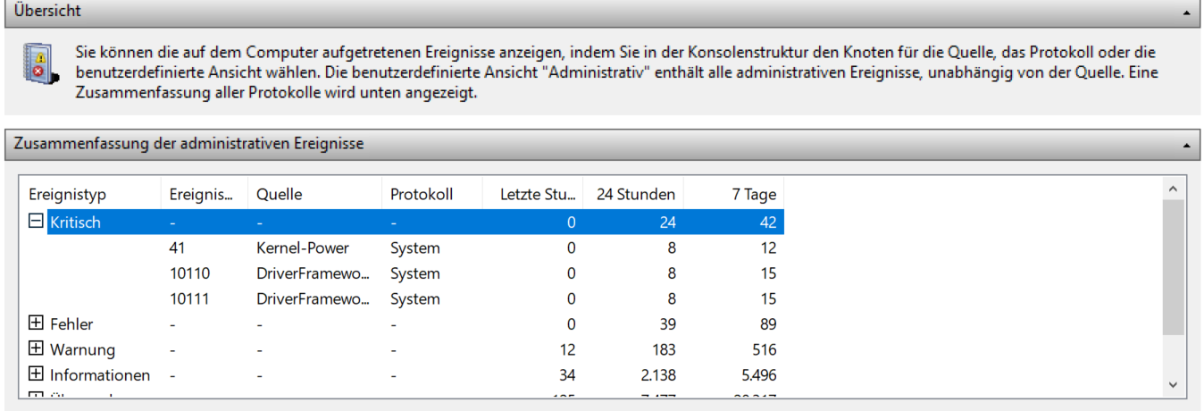 Unter Kritischen Ereignissen (Bluescreens) sieht man: