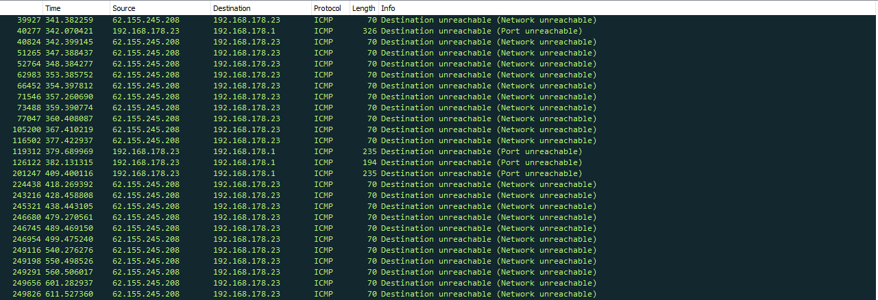 Ich habe Wireshark mitlaufen lassen aber ich kann mit dem ganzen Datenesalat kaum etwas anfangen. Das einzige was mir aufgefallen ist dass es passend zu den Disconnects ein ICMP Protokoll mit "Destiantion unreachable" gibt mit der Destination IP 8.8.8.8. oder aber meiner Gateway-IP.