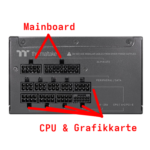 Und für die Grafikkarte nehme ich das Kabel mit den Enden PCI-E und PSU, richtig? Wo stecke ich das ans Netzeil?