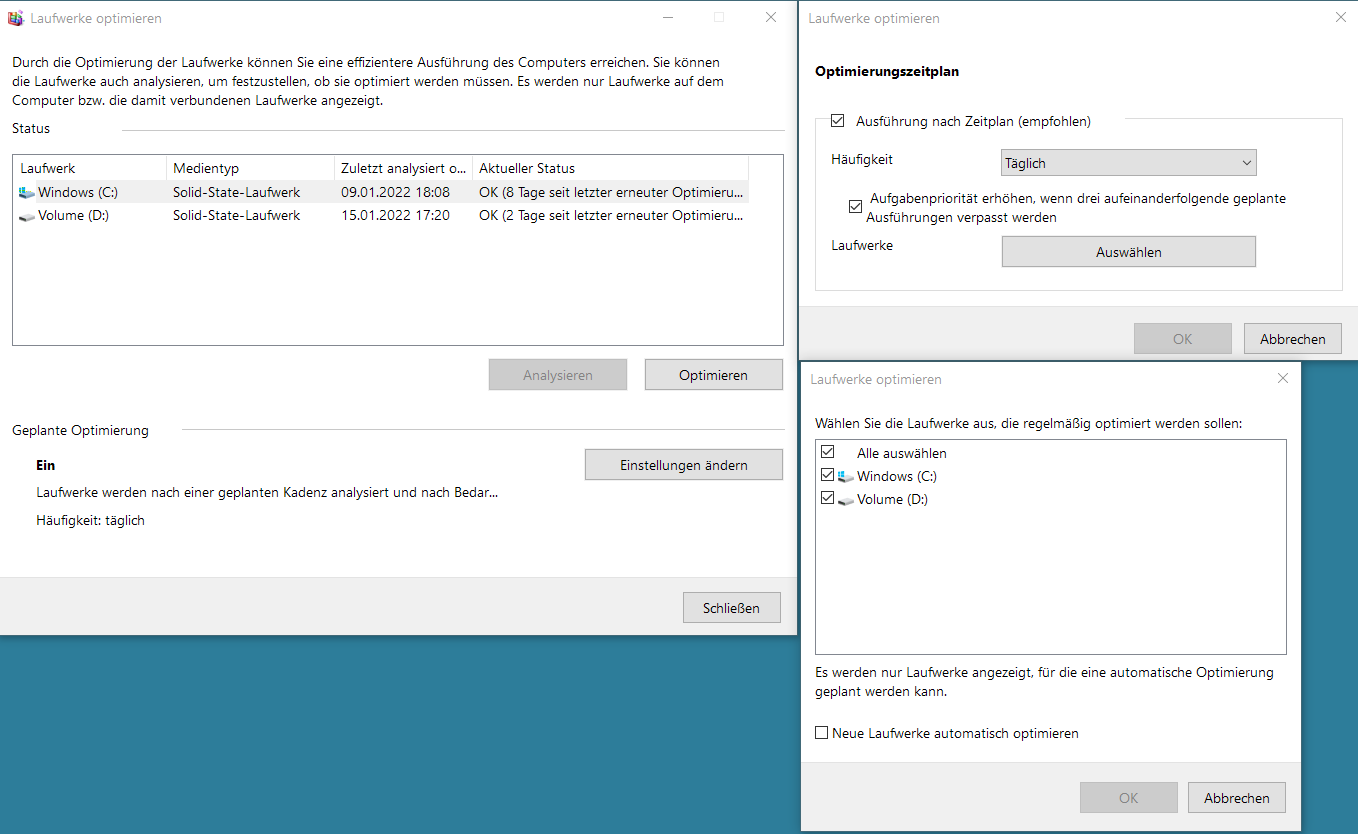 Wie man sieht wird D : (die HP) öfter geTRIMt als C :, aber beide nicht jeden Tag, wie es die Einstellungen vorgeben. Stimmt da was nicht oder passt das?