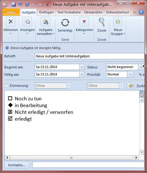 Hab mir dazu für die Notizen innerhalb einer Aufgabe eine Formatvorlage gebaut, die Kästchen, Häkchen usw. enthält. Nun trag ich die Unteraufgaben in die Notizen der Aufgabe ein und formatiere sie mit leeren Kästchen usw., s. Bild.