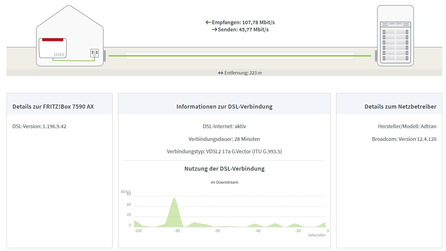Ausgangslage: 50 Mbit Leitung direkt bei der Telekom, Heimnetz über WLAN und Powerline, Router ist eine 7590 AX, das Ganze läuft seit Jahren einwandfrei.