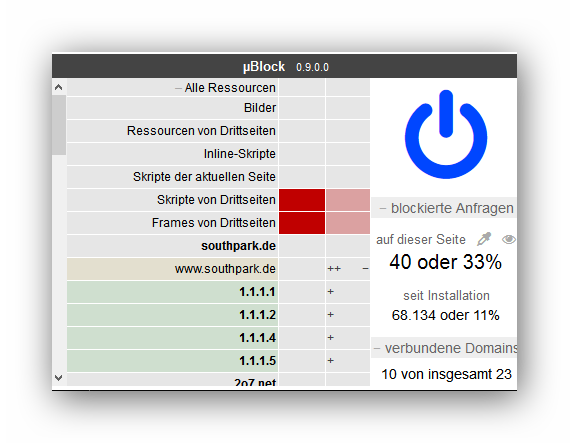 ublock schau ich mir auch zur Zeit an. Habe deswegen auch meinen voherigen Scripteblocker, ABP und Ghostery abgeschaltet und lasse nur noch uBlock laufen. Das scheint ein sehr effektives Tool zu sein. Habe als übergeordnete Einstellung gesetzt, daß "Alle Ressourcen" global blockiert werden (dann funktioniert erstmal keine Seite vernünftig). Dann geb ich für einzelne Seiten die nötigen Rechte. Ist am Anfang ein bisschen Arbeit, aber wenn man das mit allen Seiten gemacht hat die man gewöhnlich aufsucht, dann ist Ruhe