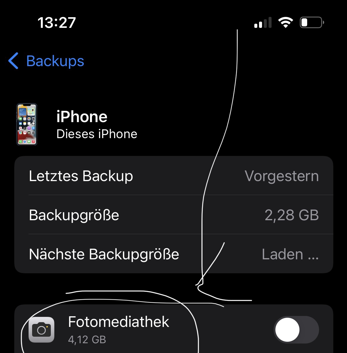 iCloud Fotos an => iCloud-Backup speichert nichts extra, da die Fotos bereits in der Cloud sind, Synchronisation und Zugriff zwischen Applegeräten möglich