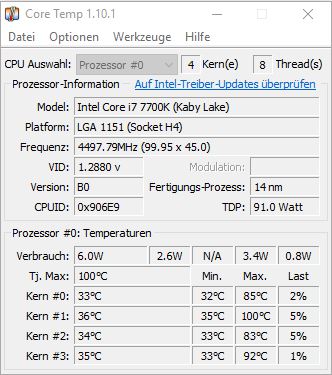 welche Ursache könnte es haben, dass die Temperatur bei Kern 1 unter Last auf 100°C hochgeht?