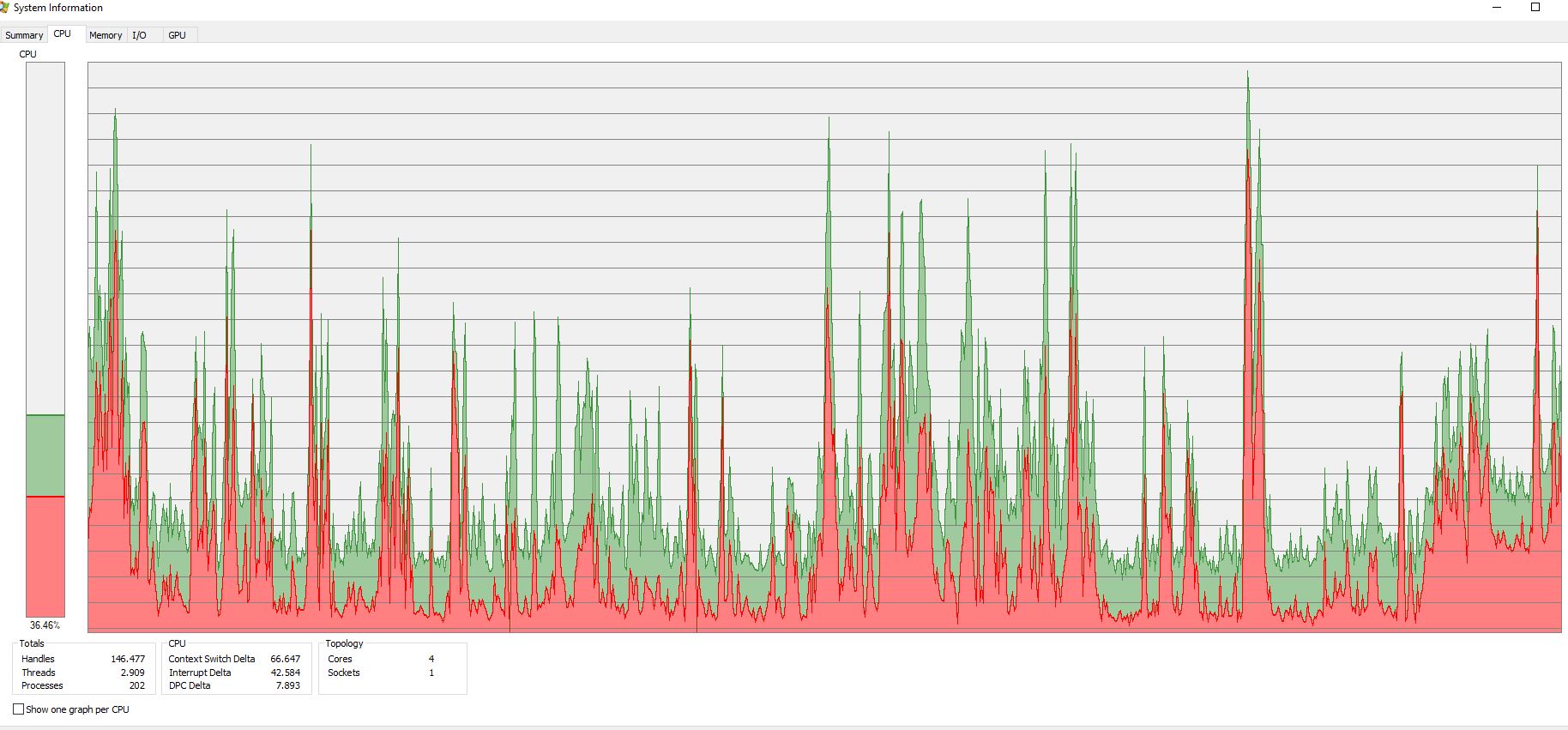 Vielleicht liegt die schwankende Fq auch an den Ausschlägen der CPU? Siehe Screenshot von Process Explorer. Oder ist es umgekehrt? In den Säulen ist meist entweder Firefox vermerkt (okay 177 Tabs, dabei Livestreaming, muss aufräumen) oder memory compression. Steht memory compression für Auslagerungsvorgänge?