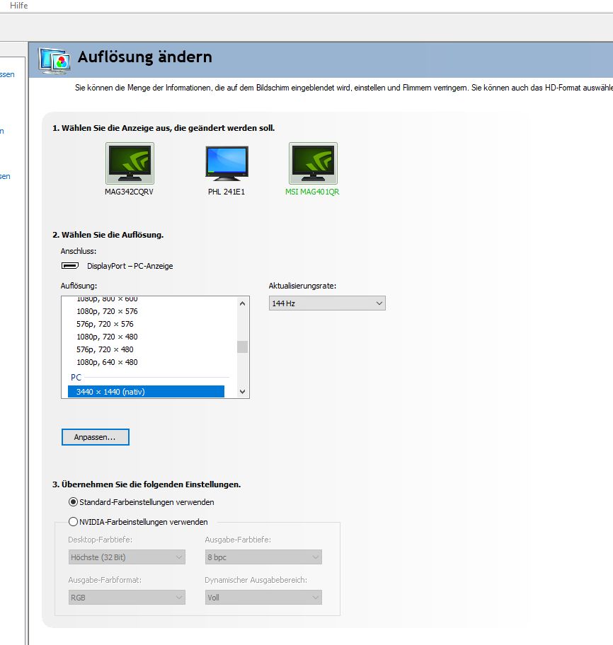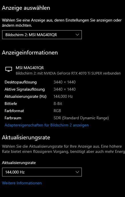 Ich habe an meinem PC 3 Monitore angeschlossen. Hier geht es nun um meinen Zweit Monitor "MSI Mag401QR". In Windows 10 und in der Nvidia Systemsteuerung wird mir die exakte Hz über 144 korrekt angezeigt, auch im MSI Overlay steht 144 Hz.