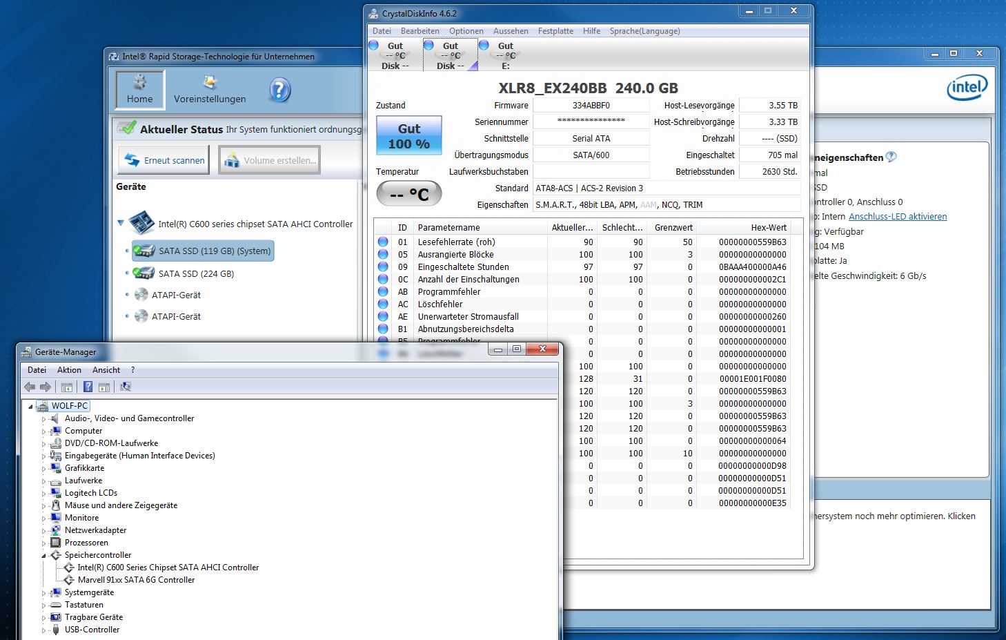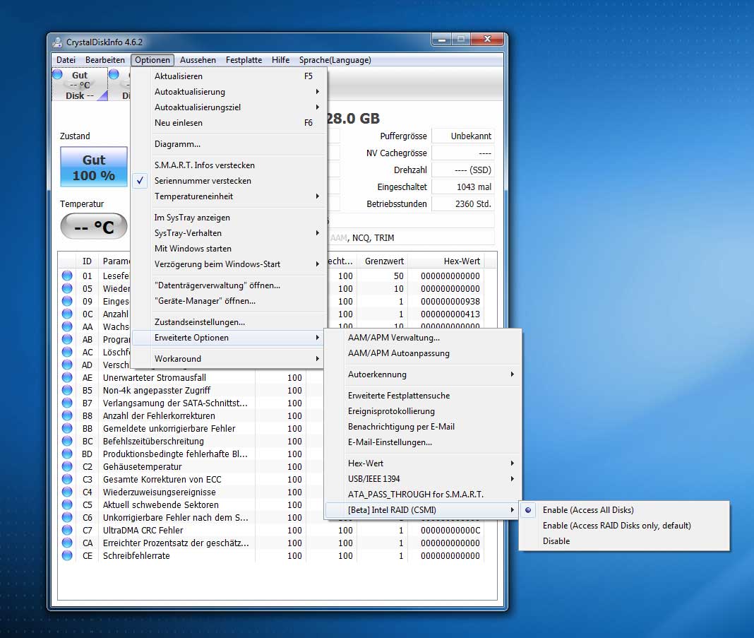 Du musst bei Crystal Disk Info 4.6.2a unter Optionen - Erweiterte Optionen - die Funktion [Beta] Intel RAID (CSMI) auf Enable (Access All DIsks) stellen, dann wird auch unter dem RST-e alles erkannt - siehe Bilder! So ist das eben unterschiedlich, von Harddisk Sentinel halte ich wenig bis gar nichts!