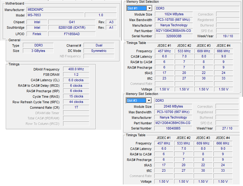 Insgesamt sind 2 Speichersteckplätze auf dem Mainboard vorhanden, wovon einer mit einem 1024 und einer mit einem 2048 MB RAM-Modul bestückt ist. Das Mainboard unterstützt bis zu 4 GB RAM. Wenn Sie RAM-Module mit verschiedenen Speichertakten kombinieren, wird die Taktfrequenz aller RAM-Module auf die Frequenz der langsamsten eingebauten Module angepasst. Bitte beachten Sie, dass unter Windows Vista/7 in der 32-Bit Edition auf Grund einer betriebssysteminternen Beschränkung maximal ca. 3,2 GB Speicher erkannt werden.