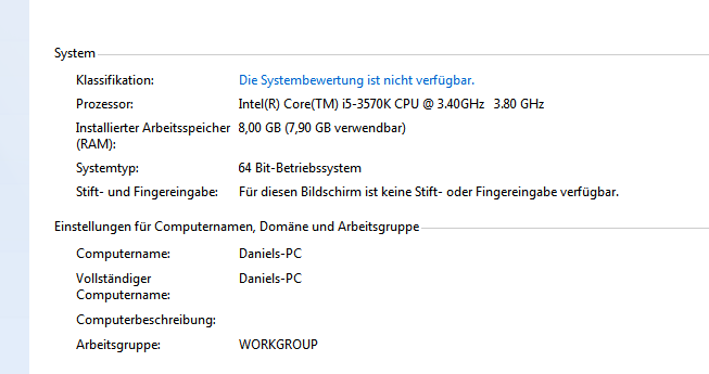 Vollgende Hardware ist verbaut: i5 3570K, Gigabyte GA-Z77X-D3H, Corsair Vengeance mit CL9 und 1600 MHz. Immoment nutze ich noch die Onboard-Grafikkarte.