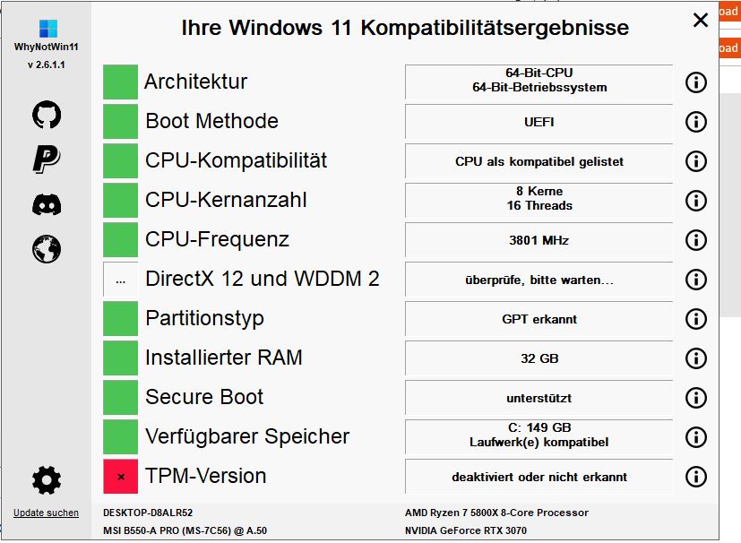 Hallo zusammen! Ich versuche verzweifelt meinen älteren Gaming PC auf Windows 11 umzuziehen. Ich bekomme hier ständig die Meldung "Ihr PC erfüllt derzeit nicht die Mindestsystemanforderungen, um Win 11 auszuführen". Dies zeigt mir zumindest die Update Route meines PC´s.