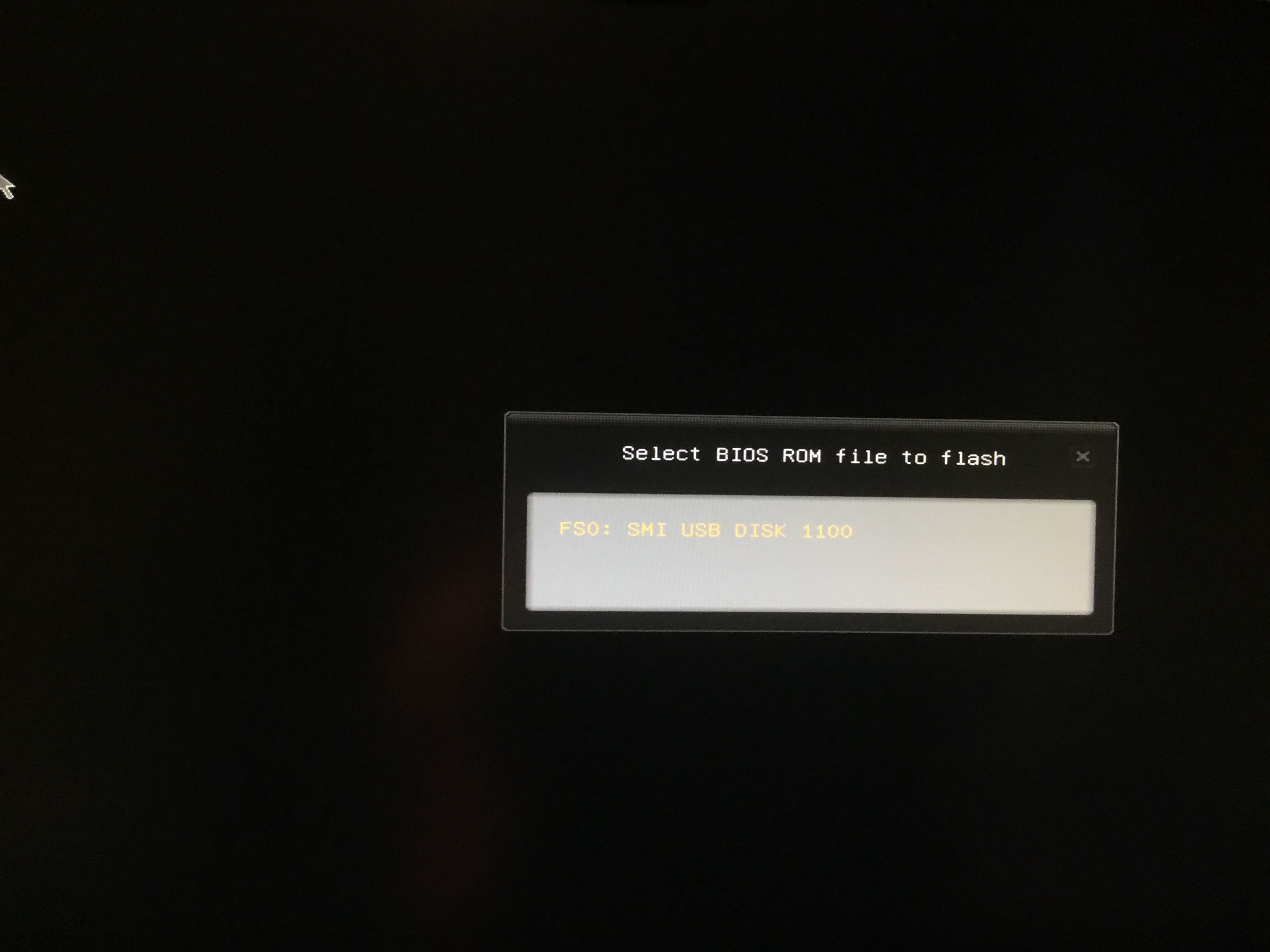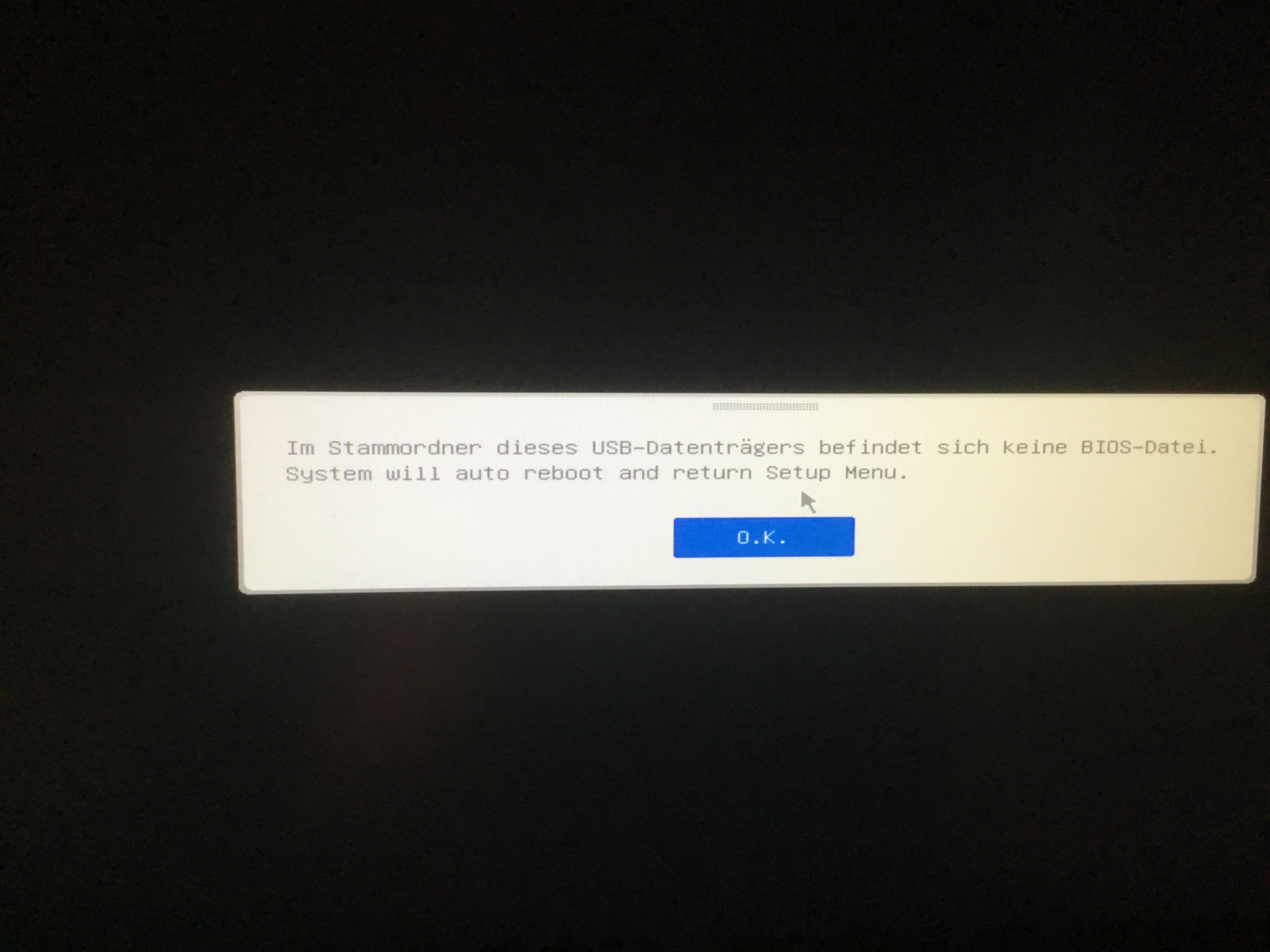 Nach der Bestätigung kommt die Fehlermeldung „Im Stammorder dieses USB - Datenträger befindet sich keine Bios Datei“ ...Sytem Reboot...