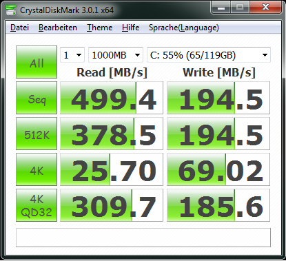Eingebaut in das System in meiner Signatur. Nur komisch das ich keine >500 MB lesend erreiche. Viele in diesem Thread schaffen dies jedoch problemlos. Im Moment hängt die Platte an dem Intel SATA ob ich den Marvel lieber nehmen sollte? Bzw. sind die Ergebnisse so in Ordnung?