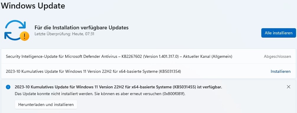 Nun habe ich aber seit ein paar Tagen folgendes in Windows-Update und es lässt sich nicht installieren. Download klappt und Installation braucht ewig lange und dann erscheint irgendwann "Wiederholen".