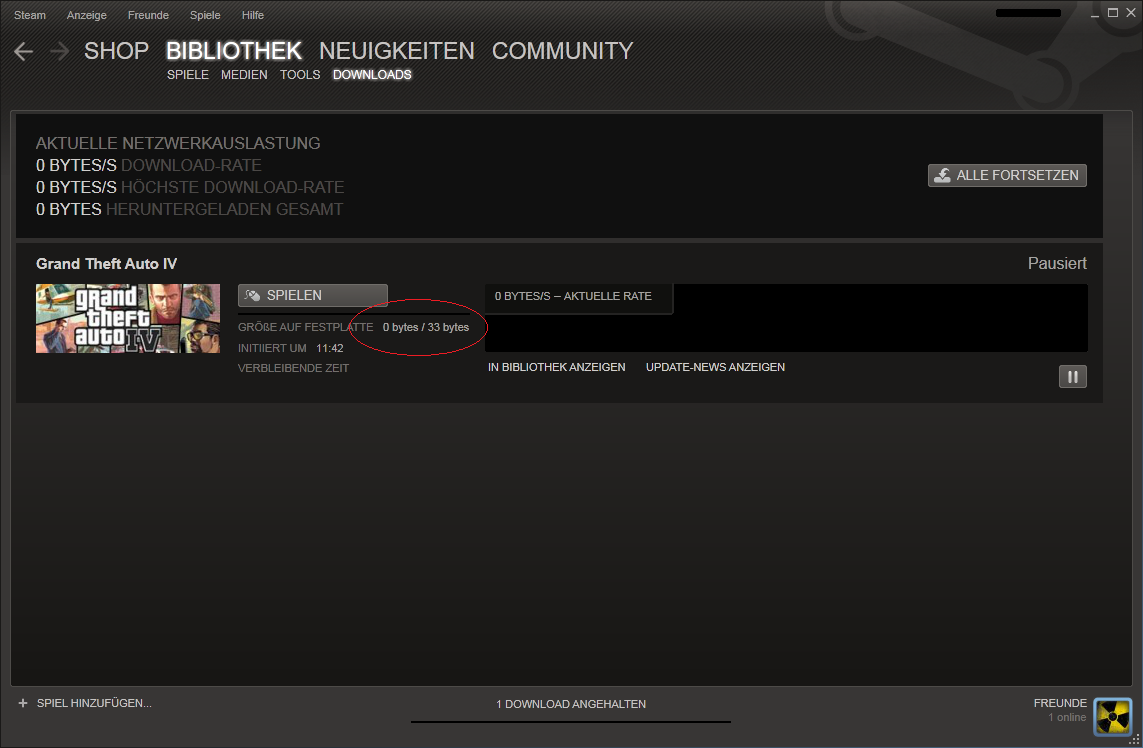 Jetzt nach dem neustart will Steam mir ein 33 Bytes großes Update vornehmen lassen. Es lädt nichts und lässt mich auch nicht spielen.