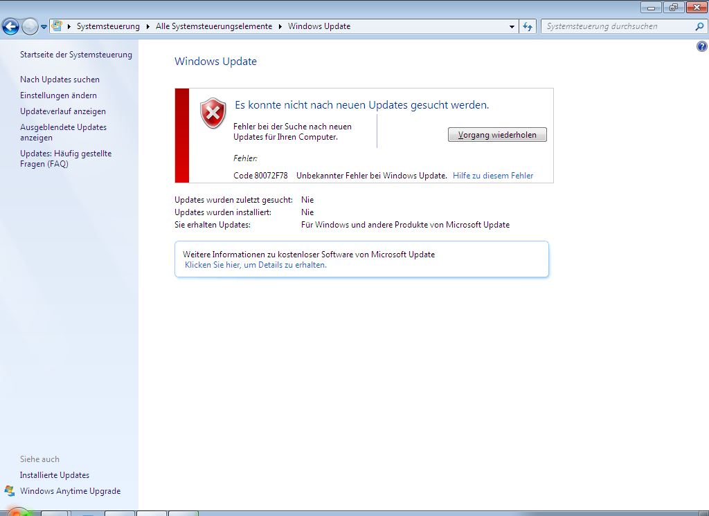 Wenn ich dann die Update-Suche versuche manuell anzustossen, kommt nach kurzer Zeit die Meldung: