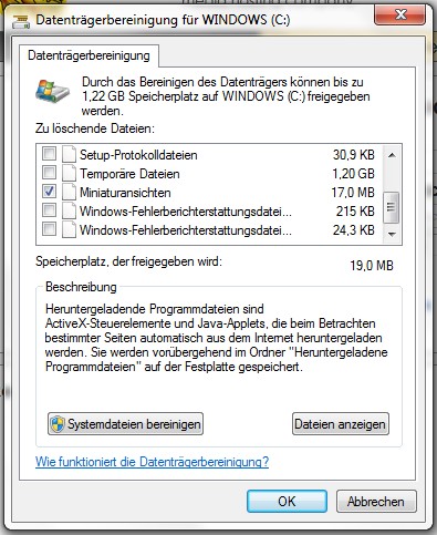 3.: Start -> Computer -> Festplatte "C"mit Rechtsklick -> Menü "Eigenschaften" -> Registerkarte "Allgemein" -> Button "Bereinigen"