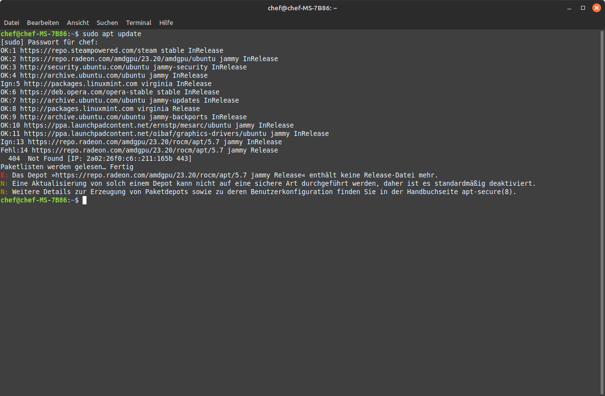 Das Depot »https://repo.radeon.com/amdgpu/23.20/rocm/apt/5.7 jammy Release« enthält keine Release-Datei mehr.