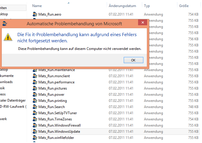 - Microsoft Fix-It Paket, das ebenfalls ein WU-Fix-It beinhaltet. Das war der Knaller, denn dieses Tool ließ sich nichtmal starten, weil es angeblich nicht für mein System geeignet ist. *tz*