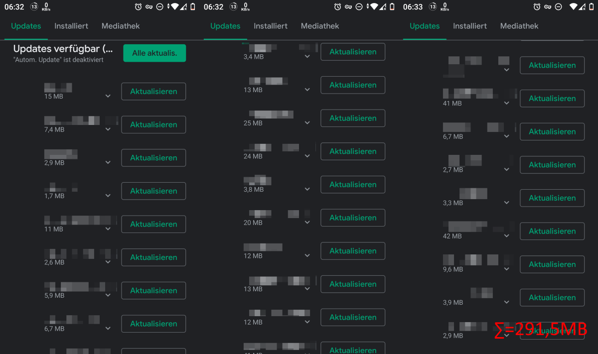 Updategrößen der aktuell anstehenen Updates: 291,5MB: