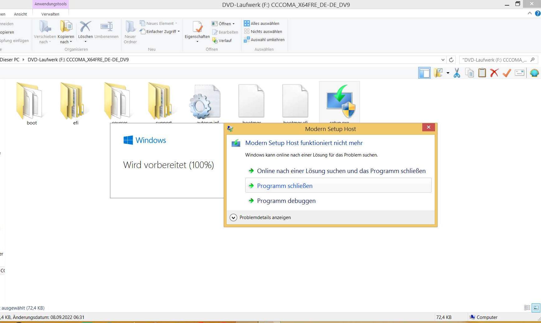 Ich habe beim 1. Installationsversuch mit Stick einen FAT32-formatierten Stick über das Media Creation Tool als Bootmedium einrichten lassen und beim 2. Mal war es ein Stick aus dem Büro, mit dem bisher schon einige Firmenrechner problemlos aufgesetzt wurden.