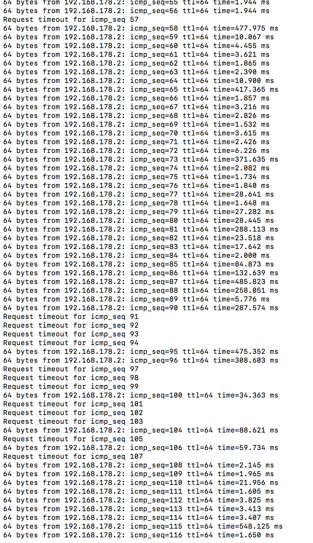 - Ping-Zeiten ab und an bereits auf das Gateway der Fritzbox wie auch ins Internet von 20-30ms auf 300-4000ms ansteigt, ab und an gibt es packet-loss. zu 70% sehe ich diese problematischen Pingzeiten, ansonsten bleibt es normal. Ich sehe keinen Zusammenhang, außer dass beim Start des Spotify-Streamings oft ein Anstieg manchmal sogar auf über 10sek Antwortzeit und völligem Ausfall des Internets zu erkennen ist.