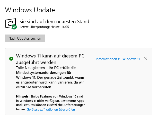 Bei mir wird das Upgrade auf Windows 11 nicht angezeigt obwohl mMn die Anforderungen dafür erfüllt sind.