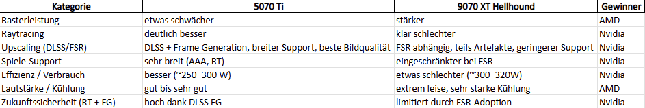 Wenn ich mir Deine Tabelle ansehe, dann sprechen da aus Deiner Sicht 5 Punkte für Nvidia und nur 2 für AMD. Das spricht doch dafür, dass für Dich vll. eine 5070 Ti die bessere Karte wäre. Ob Dir das den Aufpreis wert ist, das musst allein Du entscheiden.