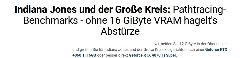 Leider passiert das auch mit RTX 4070/S die ich noch Anfang des Jahres gerne empfohlen habe, aber dank der letzten Entwicklung nicht mehr, weil dank 12GB mit ihrer Leistung in der Zukunft auch ausgebremst wird (in einigen Titeln schon heute).