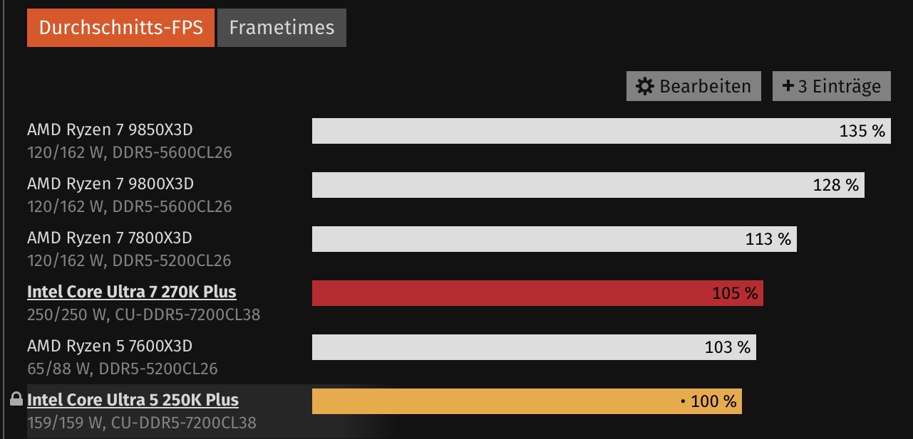 Du schaust da die Average-Fps an. Das ist durch die Spikes nach oben teils stark verfälscht. Du musst die 1% Lows und 0,1% Lows betrachten. Da ordnet sich der 270K Plus weitestgehend beim 7800x3D ein, je nach Spiel auch mal deutlich darüber (z.B. Spiderman 2, Indiana Jones). Schaust Du z.B. bei PCGH die benchmark-Tabelle an, dann wird mit 5600MTs getestet. Mit 7200MTs wäre der Prozessor nochmals minimal schneller, aber nicht brachial schneller als mit 5600MTs.