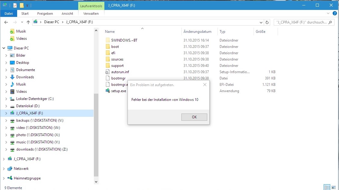Kopier das Setup in einen lokalen Ordner am PC und starte es von dort. Hatte das auch schon oft, dass genau diese Meldung via USB kam. Mit einer Installation, direkt von der Festplatte aus, ging es aber.